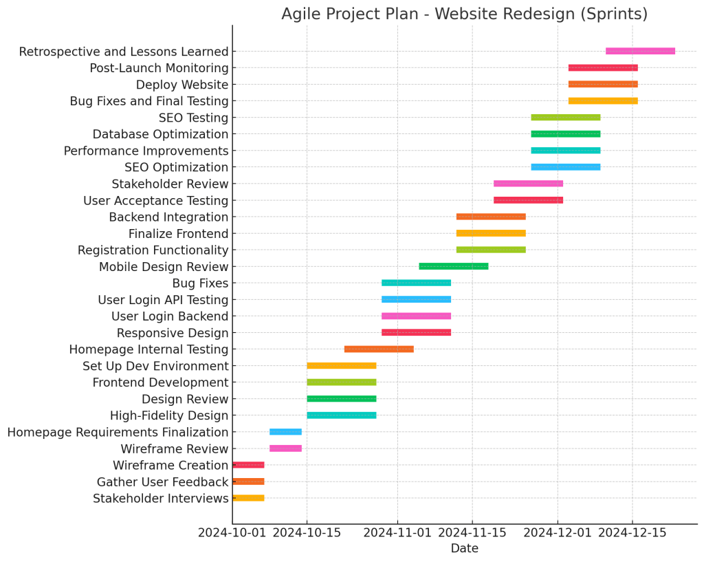 In Agile, projects are broken down into smaller, iterative cycles called sprints. Instead of following a linear path, Agile teams work on incremental progress and adapt to changes throughout the process. Here’s a sample Agile project plan for the same website redesign use case.